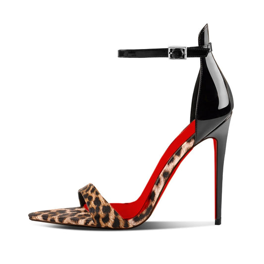 New leopard print pointed toe exposed toe straight strap thin heel sandals for women, sexy red soled fashion high heels