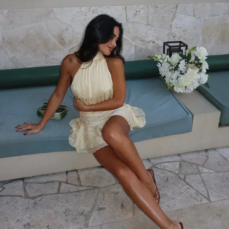 Robe courte sexy dos nu pour femme, couleur unie, sans manches, plissée, en mousseline de soie